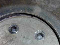 (photos link to larger images)![]() ![]() These arrows point directly up when #1 cylinder is at TDC (top dead center). Regardless, mount the flywheel to the crankshaft so these 2 arrows coincide, and you've done it correctly. If done incorrectly, the arrows will be 180º opposite each other. Replacement flywheels and/or crankshafts may not have the arrow marks. If not, then simply turn the crank so #1 & #4 cylinders are at TDC, and mount the flywheel so that the timing marks are on the passenger side of the engine (approx. 9 o'clock as viewed from the front of the engine). *** NOTE: It has been rumored that some flywheels were incorrectly stamped with the timing marks in the wrong place. If you have one of these, then the timing marks will NEVER line up with the hole in the backing plate, and you'll need to add timing marks to the front of the engine (pulley & timing cover) to facilitate use of a timing light, or get another (correctly marked) flywheel (but also see "Balanced" below). See: "Checking The Flywheel & Crank", below. |