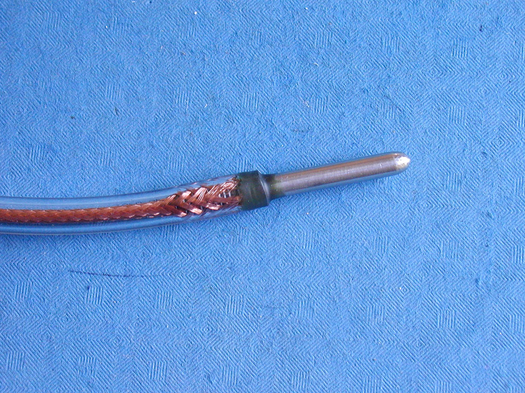 The inside diameter of the hose is slightly smaller than to outside diameter of the bolt braid combo, so it's a bit of a tight fit. But this is good! The tight vinyl contraction keeps the copper braid firmly pressed against the bolt threads, without solder! (you can see the vinyl "bulge" over the copper).